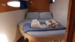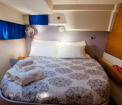 There are 4 cabins, each with a full-size bed for 2 adults. Each cabin has a private bathroom with sink, toilet, and shower. All cabins are very clean with quality linen. It can comfortably accommodate up to 4 couples, 8 guests. It also has 2 side bunks in the hallways outside of the rooms which are less comfortable, but if used can then accommodate up to 10 people.